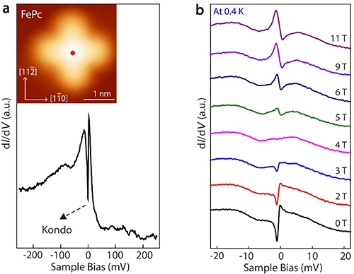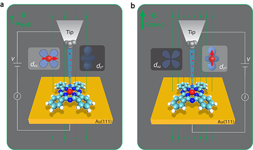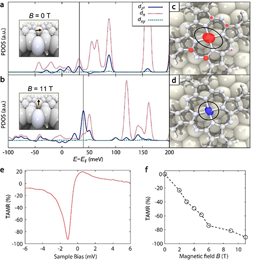 The single-molecule device in this work consists of an FePc molecule attached to a Au(111) surface and an STM tip (Fig. 1). The two metal electrodes (Au and tip) serve as the source and drain. They measured differential conductance (dI/dV) spectra at the Fe center of the molecule at the temperature of 0.4 K. At zero magnetic field, a sharp Kondo resonance is present around the Fermi level, and the Kondo resonance shows dip-to-peak transitions with increasing magnetic fields (Fig. 2). To gain a better understanding of the change of spin states with magnetic fields, they studied the spatial distribution of the Kondo resonance over the FePc molecule by performing spectroscopic mapping near the Fermi level under varying magnetic fields (Fig. 3). At zero or low fields, the Kondo resonance (dip) shows a non-circular spatial distribution, while at high magnetic field the Kondo resonance (peak) is more localized on the molecular center, with a radial symmetry. Density-functional first-principles calculations shows that the low-energy density distribution of the two most relevant d orbitals (dxz/dyz  and dz2) around the Fermi level depends strongly on the orientation of the magnetic moment. Thus, the pathway of single electrons through the orbitals of a magnetic molecule can be tuned at a very low energy by varying the external magnetic field. While at zero field the electron density scattered through the Kondo resonance will be exclusively at the dxz/dyz orbital, it will pass through the dz2) orbital at high field, and a varying part of the density will pass through both orbitals in the intermediate regime. The magnetic reorientation of the Fe center by varying the magnetic field also leads to the tunneling anisotropic magnetoresistance (TAMR), and they demonstrated a tunable TAMR at the single-molecule level, which is up to 93%, adding a new dimension of control to molecular spintronics.
