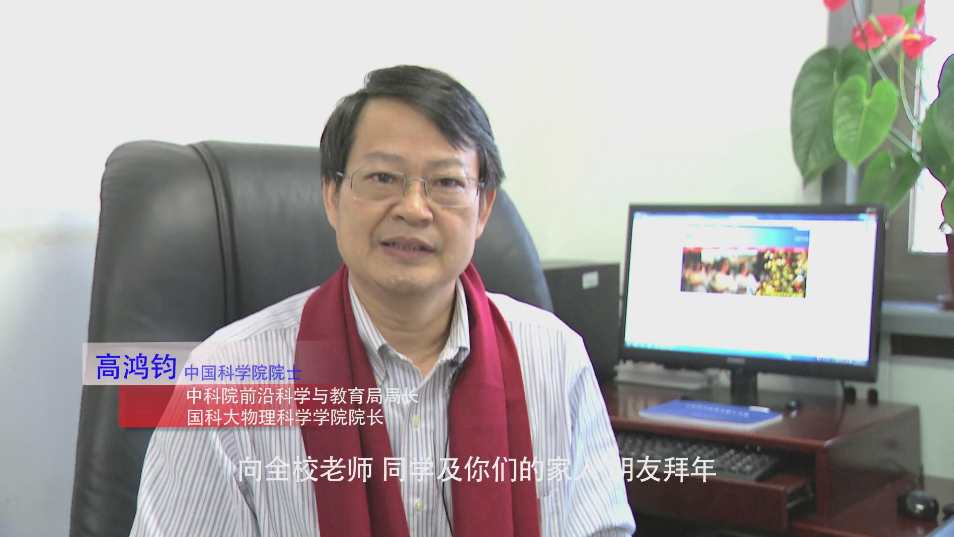 大家好!我是中国科学院大学物理科学学院院长高鸿钧,值此新年到来之际,我谨代表国科大物理科学学院,向全校老师、同学及你们的家人、朋友拜年!祝大家身体健康,新年快乐!物理是一门研究物质结构相互作用和运动规律及其实际运用的基础性学科。历史上,中国科学院与物理学相关的研究所汇集和造就了一大批为新中国科技事业发展做出重大贡献的科学家,包括大部分“两弹一星”元勋。现在由研究所承办的国科大物理科学学院,以卓越为发展目标,坚持研究方向多元化与资源共享,倡导新方向、新学术和新应用,结合国家重大战略需求,攻坚克难,坚持教学体系的不断改革完善,采纳国际领先的教育思想,培养一批未来物理学的国际领军人才。2015年1月,我们的“科教融合”物理科学学院启航,过去的一年中已有显著发展。相信在我们大家的共同努力下,“科教融合”物理科学学院将成为国际物理学领域最有影响力的几个学院之一,中国科学院大学将成为国际顶尖大学,让我们一起努力!