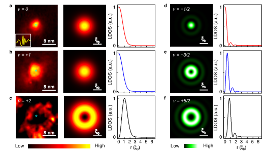 图三,拓扑涡旋(左)中前两级涡旋束缚态的波函数呈现实心分布,而平庸涡旋(右)中只有第一级束缚态呈现实心分布。拓扑涡旋的独特性质是由于狄拉克表面态参与导致的。