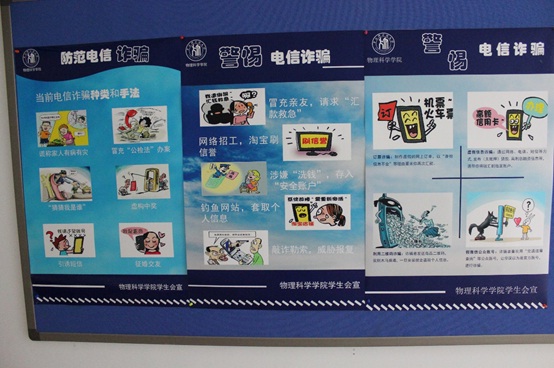 为进一步加强校园安全宣称教育工作,提升学生的防范意识,物理科学学院于四月一日开始进行为时一周的防诈骗宣传活动。