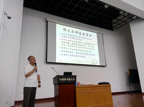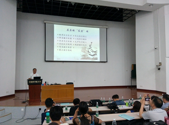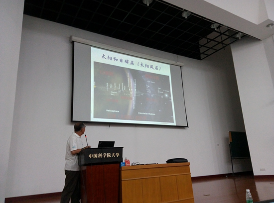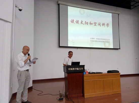 2016年6月20日上午,“中学教师再回大学”活动在玉泉路校区阶梯教室举行,中国科学院国家天文台汪景琇院士为来自全国12个省的重点中学老师做了题为:“谈谈太阳和空间科学”的报告。讲座由中国科学院大学物理科学学院的郑阳恒教授主持。